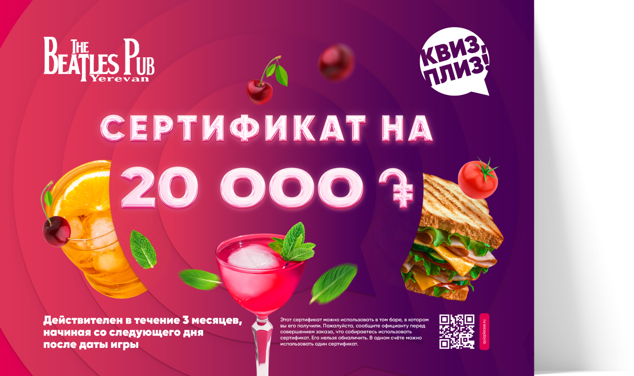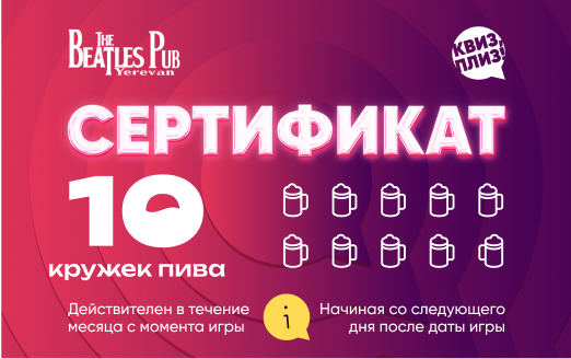 The Beatles Pub, впервые открывший свои двери ещё в 2008 году, является одним из самых давних пабов Еревана. Отличный выбор для любителей классики не только на играх Квиз, плиз! Вкусные закуски в лучших традициях английских пабов и богатая барная коллекция на любой вкус. От эксклюзивного пива, до более чем 200 наименований виски. Зависать здесь можно круглосуточно. А по выходным можно зависать вместе с Квиз, плиз!